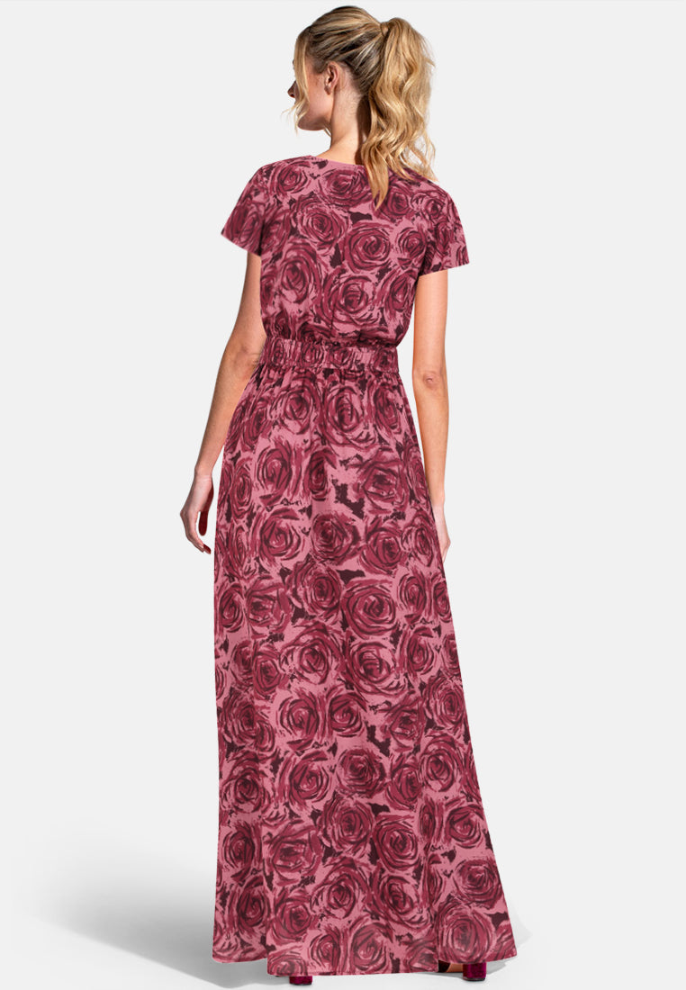 Effortless elegance in a mock-wrap maxi dress with a wrap V-neckline and flowing floor-length skirt. The dusky rose base with delicate rose line-art print makes it perfect for resort wear, garden parties, summer holidays, evening events, and capsule wardrobe staples. Made from lightweight, easy-care fabric, it’s travel-friendly, fuss-free, and ready to dress up or down.