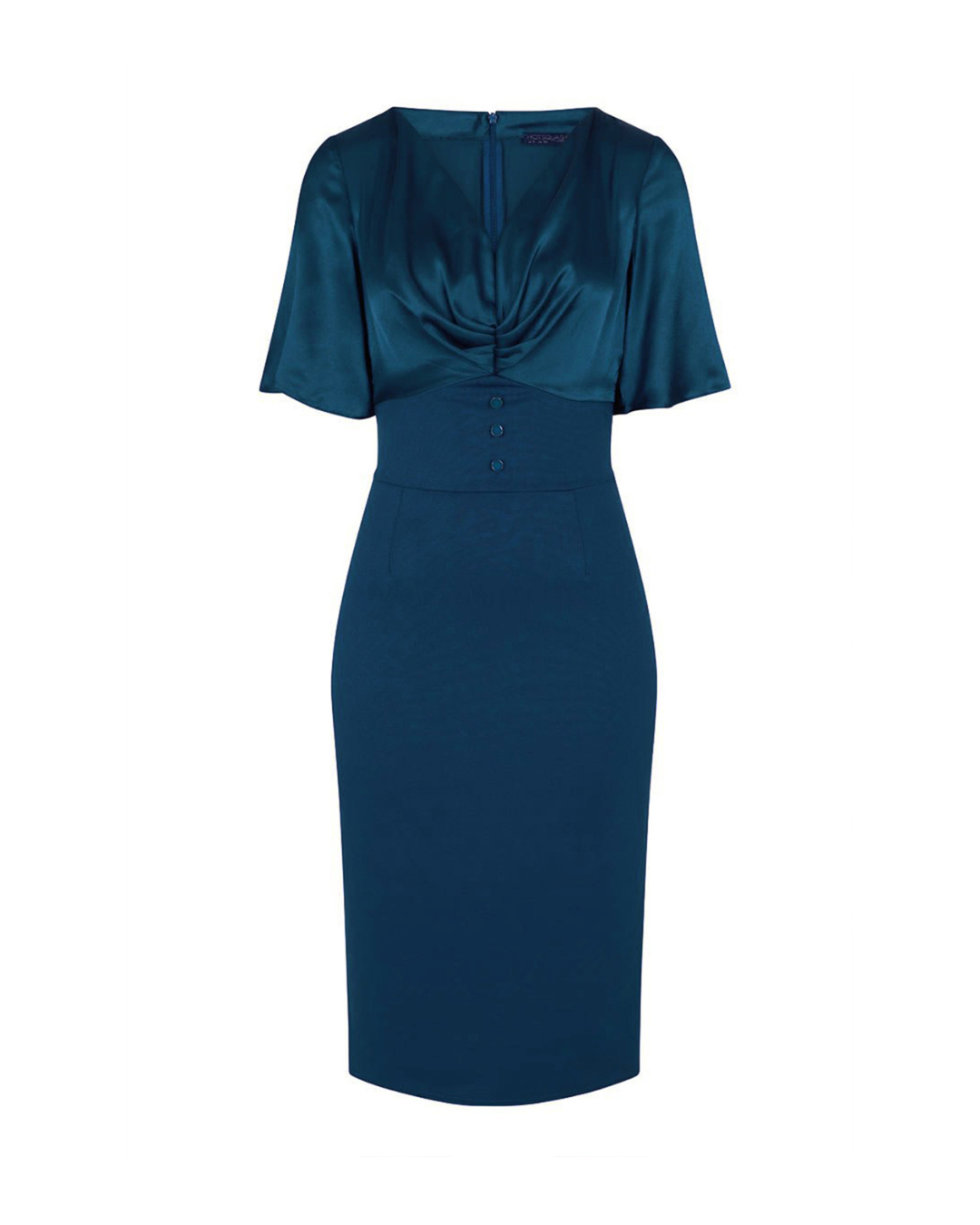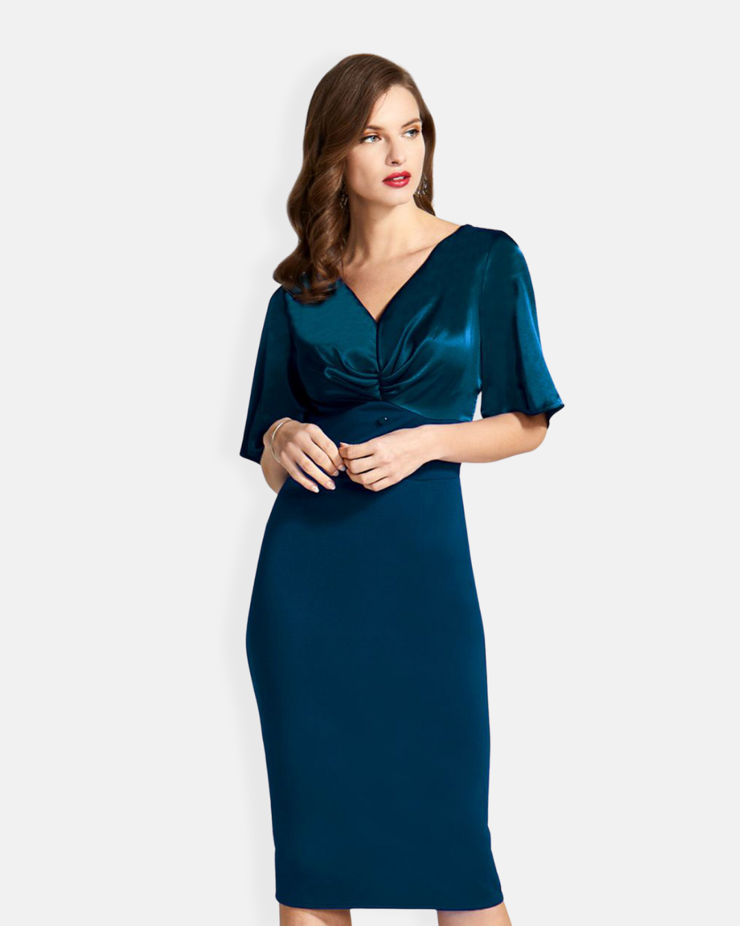 Stand out from the crowd in this gorgeous HotSquash London satin top pencil dress! The V-neck design with short flutter sleeves is the height of feminine chic, while the figure-hugging pencil skirt falls just below the knees adding an element of sophistication to the outfit. This is the perfect cocktail dress, suitable for any party or event. This style is fastened at the back with an invisible zip.